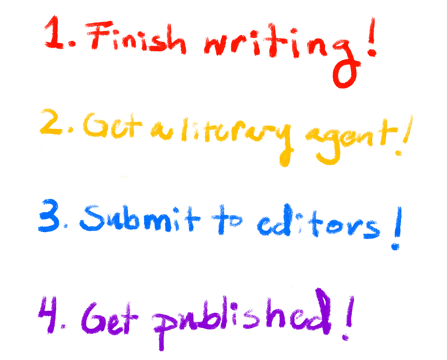 Hello! In my last newsletter, I mentioned that I wanted to use this reflection to discuss what happens after I "finish" my novel—and following a shockingly productive weekend of writing (I'm over 80%!!) that feels particularly salient. So, let’s chat. I’ve mentioned before that I plan to (attempt to) go the traditional publishing route to publish Project Curses. There are a lot of reasons for this (e.g., gaining valuable experience, perceived prestige, building industry connections), but the main one is that, while indie publishing is a totally viable route these days, it requires a lot of time, and a lot of effort, and building a lot of expertise in marketing, publicity, and promotion. That’s fine, but I already have a full-time job, and I’d like to spend what little time I do have focused on writing. So, the traditional route it is. To prepare myself for this, I’ve started to do some casual(ly obsessive) research into how traditional publishing works—I’ve read books, blogs, and articles, listened to podcasts and lectures, and talked to the one industry connection I have, all of which has been eminently helpful…albeit demoralizing. At an elementary level (note: I’m using crayons for emphasis), the path forward looks a little something like this: Easy, right? I mean, it really isn’t not easy—these are the necessary steps to getting my book on shelves. And, c’mon, it’s written in crayon. But, as always, the devil is in the details. Let’s take a closer look at those steps: Okay. Wow. That’s definitely more intimidating. And, to be real, this is still a very stripped down version of what goes into getting a book into the world...I just couldn't be bothered to write more little blurbs. But it should be clear there’s a lot of uncertainty in the process, and there are long, long odds (note: I also want to recognize that these odds aren’t even that bad, for me; folks who have intersectional identities which have been marginalized in any way—be it their sex, gender, ability, color, creed, or origin—have an even more difficult time breaking into the traditional publishing space). Still—it is manageable, and tantalizingly possible. I believe I can do it. What’s more—and it’s hard for me to write this, because I have an almost pathological aversion to praising my own work—I’m really proud of the story I’m telling, and I genuinely believe it can go the distance. Hand-wringing and second-guessing aside, let’s take a look at what the rest of the year will actually look like for the novel. These are rough estimates, of course—and this is an aggressive timeline—but I feel good about it. Writing this initial draft—proving to myself that I can write it—has been the hardest part. The rest will follow. Or not. It's okay either way!